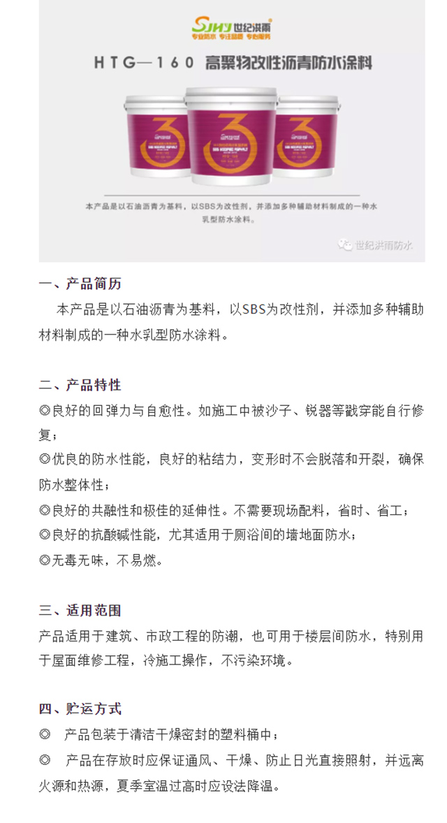 HTG-160高聚物改性瀝青防水涂料是以石油瀝青為基料,以SBS為改性劑,并添加多種輔助材料制成的一種水乳型防水涂料。