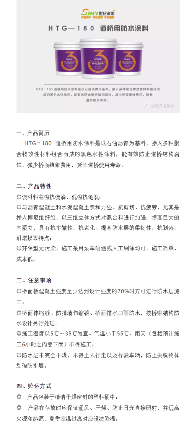 HTG–180 道橋用防水涂料是以石油瀝青為基料,摻入多種聚合物改性材料組合而成的黑色水性涂料,能有效防止道橋結構腐蝕,減少橋面維修費用,延長道橋使用壽命。
