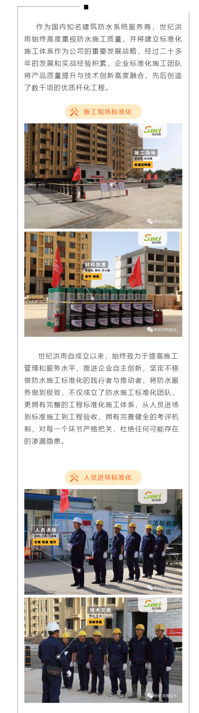 作為國內知名建筑防水系統服務商,世紀洪雨始終高度重視防水施工質量,并將建立標準化施工體系作為公司的重要發展戰略,經過二十多年的發展和實戰經驗積累,企業標準化施工團隊將產品質量提升與技術創新高度融合,先后創造了數千項的優質桿化工程。
